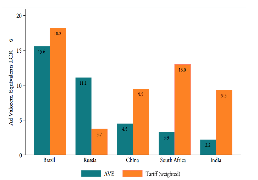 Figure 2.7: Ad valorem equivalents LCRs and weighted tariffs for BRICS