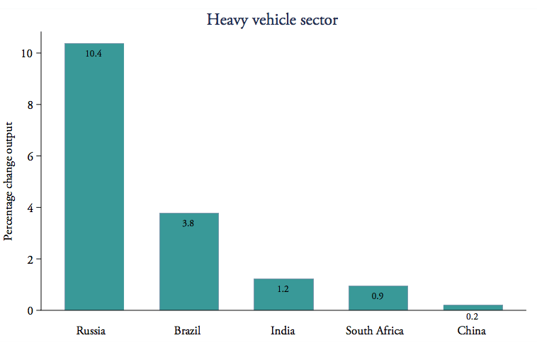 For example, while industry output in the heavy vehicles sector increases between 0.2% in China and 10.37% in Russia, the domestic production of other transport equipment and other machinery in Russia and Brazil decreases by -0.16% to -0.37%. While it is only natural that industry output that is subject to protection by LCRs increases, the analysis shows that this effect is outweighed by the detrimental side effects. LCRs raise the price of the product it protects and of the product which requires protected inputs, in this case heavy vehicles. As a result, this raises expenditures for every buyer in the economy, which has a depressing effect on sales and output also in other industries. Final consumers as well as firms have to reallocate resources from other areas in order to pay for more expensive vehicles and vehicle parts. Over time LCRs can therefore lead to lower competition, less innovation, and less product variety in the domestic market, which reinforces the negative effects of LCRs.