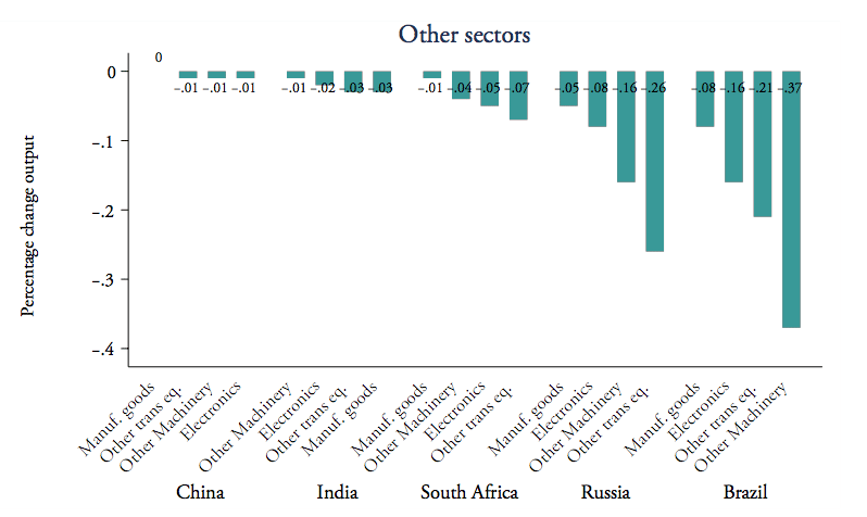 Indeed this boost to the heavy vehicles industry comes at the expense of other industries since resources in the economy need to be re-allocated. In fact, the expanding heavy vehicles industry needs more labour and capital, which is withdrawn from other sectors. Figure 2.9 shows that especially for some of the closely related sectors, which require similar production factors as the heavy vehicles sector, their output decreases because resources are taken away from their industries. This effect is particularly large in Brazil and Russia. Since both countries have the highest AVEs of 15.6 percent and 11.1 percent respectively, which therefore reduces their imports most, they also experience the biggest expansion of their domestic heavy vehicles industry, which in turn draws away many resources from these other sectors. More specifically, in Brazil and Russia the domestic production of other transport equipment decreases with respectively -0.21 and -0.26 percent and of other machinery with respectively -0.37 and -0.16 percent.