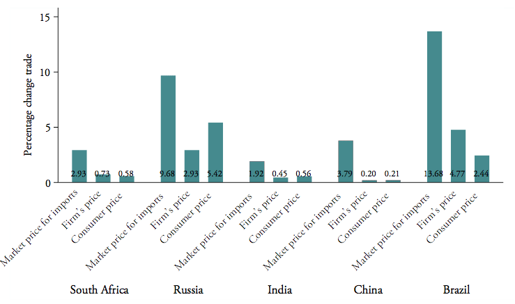 Estimating the impacts of the collected LCRs on the economy in the BRICS countries shows that their impact is at least threefold. First, the LCRs have a negative impact on trade in heavy vehicles in the BRICS countries. The identified LCRs are estimated to restrict imports of heavy vehicles by -21% and -12% in Brazil and Russia, while for the other BRICS countries imports of heavy vehicles are reduced between -9.3% and -3.7%. Although to a much lesser extent, the identified LCRs also reduce BRICS countries’ exports of heavy vehicles. Second, LCRs significantly increase the prices for imported heavy vehicles leading to higher prices for firms as well as consumers. The prices firms have to pay for intermediate goods in the heavy vehicles sector are estimated to increase up to 2.9% and 4.8% in Russia and Brazil. Consumer prices for heavy vehicles are estimated to rise between 0.2% and 5.4%. Third, our estimations show that LCRs increase industry output in the targeted sector, but only at the expense of other closely related industries which decrease their industry production.