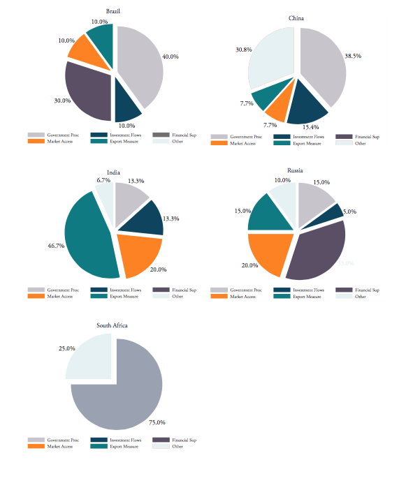 The two final categories which have a slightly lower appearance in our database are those related to investment flows and other local content requirements. The latter category covers mainly data localization policies. One country that has both types of LCRs in place is China. China has a strong local content conditionality on the opening of its markets to foreign investments, but also shows various strict local requirements regarding data. Russia also holds strong data localization requirements. Across the BRICS countries, government procurement LCRs are the most popular types, except in India and Russia. In India, LCRs related to export measures are far more popular and almost half of all LCRs that India has implemented are related to this category. Russia’s LCRs are most likely to stipulate some form of financial support for companies. In both countries, market access LCRs are also prevalent. An overview can be found in Figure A1 in the Annex.