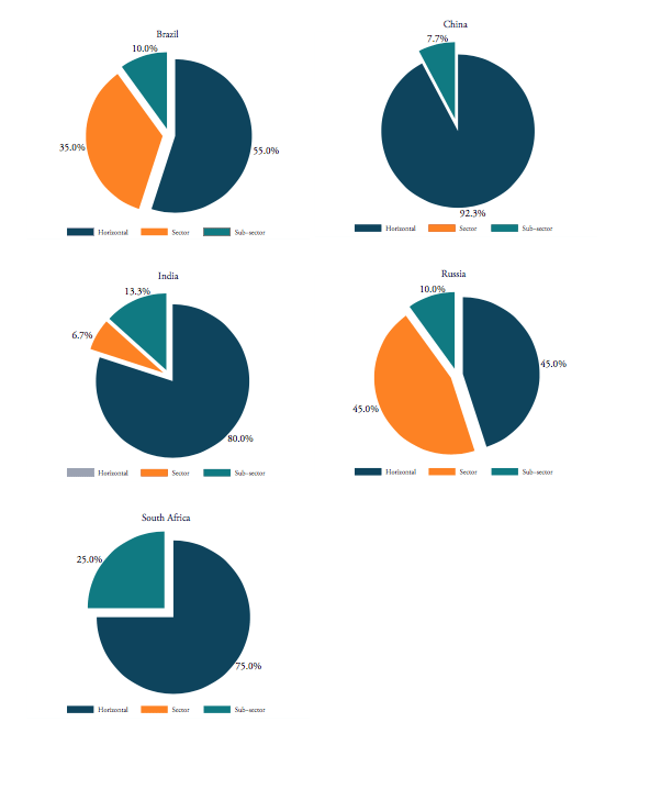 A country-specific analysis in Figure A3 shows that indeed across all countries most LCRS are comprised of a horizontal nature. In China, India and South Africa more than three thirds of the LCRs are applied on a horizontal level, while in Brazil more than half of the measures are horizontal and in Russia slightly less than half which are horizontal. These latter two emerging economies have a much higher share of LCRs which are specifically targeted at the automotive industry. Narrowing down to the specific sub-sector of heavy vehicles, our analysis also shows that all BRICS countries have LCR measures in place which specifically target the sub-sector of heavy vehicles.
