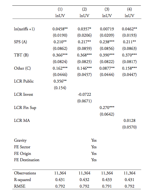 The AVEs are estimated following the methodology by Cadot and Gourdon (2015). This methodology uses a gravity framework to assess various Non-Tariff Measures (NTMs) such as SPS and TBT measures sector by sector. In our case, we extend their methodology to include LCRs on top of the NTMs and all other trade costs barriers as well as control variables.