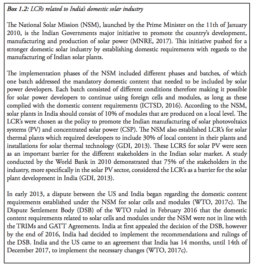 WTO (2017c): DS456: India — Certain Measures Relating to Solar Cells and Solar Modules. Available at: https://www.wto.org/english/tratop_e/dispu_e/cases_e/ds456_e.htm (retrieved on 17 September 2017)