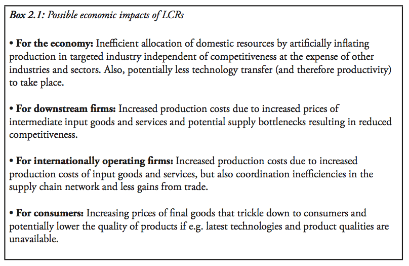 LCRs are policy instruments that can have pernicious effects for international trade, productivity and welfare for the country imposing them. LCRs artificially increase the use of input content from domestic suppliers where they apply. This creates inefficiencies in the supply chain for the firm using these inputs, because more competitive inputs are not (internationally) available for the company. More than often domestic input suppliers are not the best ones in terms of price and quality for domestic and international operating firms. LCRs therefore limit the availability of competitive products in the domestic market when the company cannot import better or cheaper inputs from abroad.