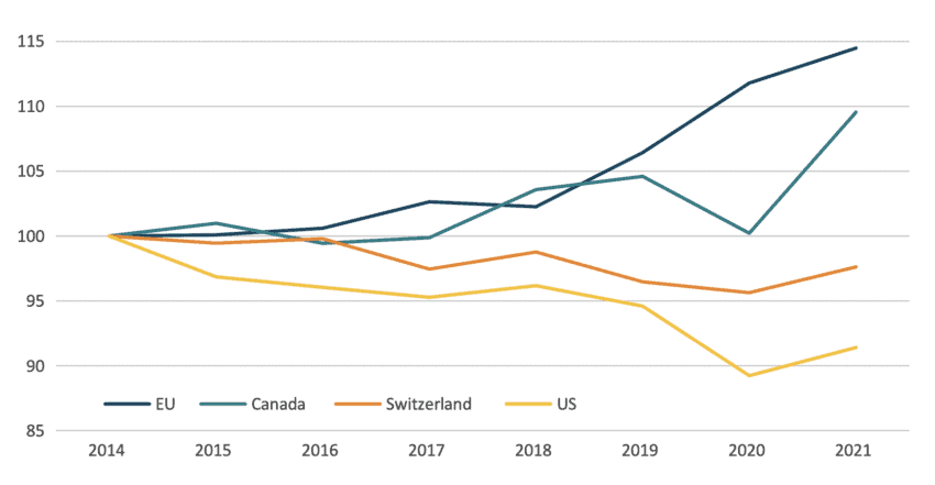 Source: Author’s calculations based on the OECD Trade by Enterprise Characteristics database, StatCan and US Census. Data indexed on 2014, as base year (2014=100).