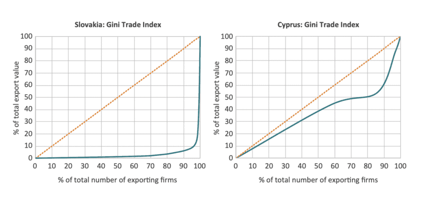 At the same time, both Slovakia and Cyprus have many exporting SMEs. In fact, both countries have a similar share of SMEs in the total number of exporting firms (around 97%). But Slovakia has the lowest share of SMEs in the value of exports (18%) across all EU Member States, compared with 91% in Cyprus, the EU member states with the lowest GTI (the most equal distribution of export value across its exporters). This stark difference is also visible in Figure 4, with Cyprus having an export distribution Lorenz curve much closer to the diagonal than Slovakia. So, when looking at such firm-level KPIs, the differences in GTI values start to make a lot of sense.