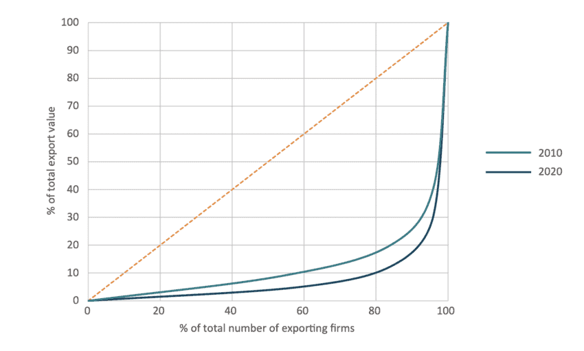 Becoming an exporter is not easy. In any given country, only a small proportion of firms engage directly in international trade. As a result, global trade tends to be very skewed, with a small number of large firms accounting for a disproportionate share of total trade values. In the United States, the top 1% of trading firms (exporters and importers) account for over 80% of the value of total trade (Bernard et al., 2007). The top 1% of exporters account for more than 50% of Italian exports (Marin et al., 2015) and almost 60% of Portuguese exports (Cabral et al., 2020). Freund and Pierola (2012) also found a skewed trade distribution across a large sample of developing countries.