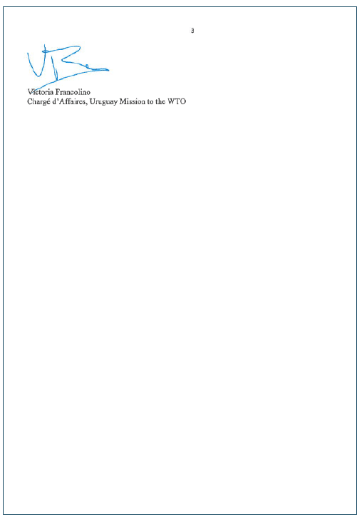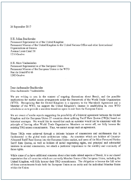 On 26 September 2017 a letter was sent to the UK and EU Ambassadors to the WTO by their counterparts from Argentina, Brazil, Canada, New Zealand, Thailand, USA and Uruguay. Regarding initial conversations about establishing UK specific WTO schedules, the letter stated:
