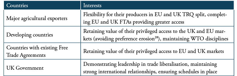 It will probably be more difficult to satisfy these interests than domestic ones in UK TRQ negotiations. Major agricultural exporters already have a number of issues with the EU around TRQs and Sanitary and phytosanitary (SPS) regulations[6], and this split is a chance to make progress on these with the EU, and set a new framework with the UK. Balancing different country interests, alongside developing country interests, in the context of the UK government’s interest in being a leader in trade liberalisation, will be challenging.
