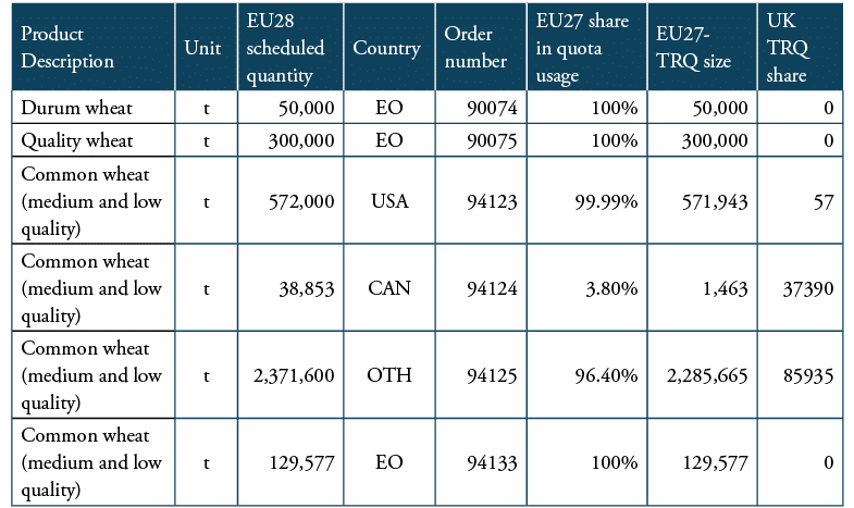 Take the example below of wheat. The table[4] shows the different TRQs in operation for wheat, and the percentage that the EU has calculated based on import licenses has gone directly into the UK or the remaining EU-27, based on an average for the years 2013-2015. It is intended that the last two columns will be the future TRQs for the EU27 and UK.