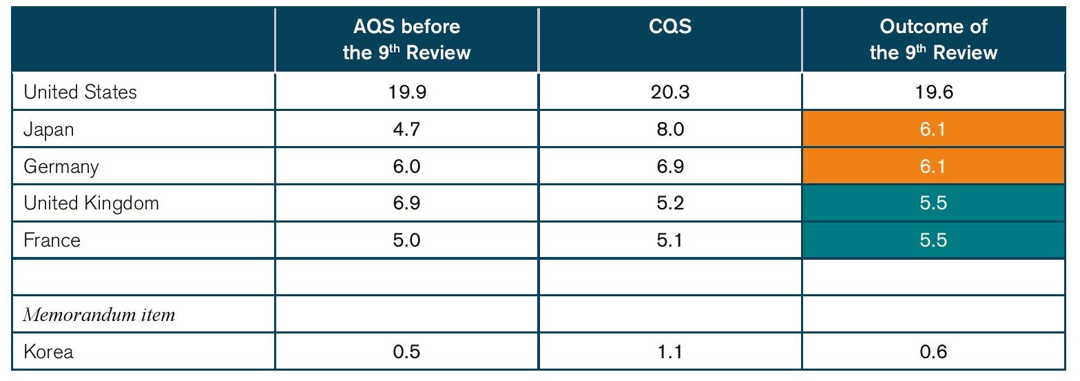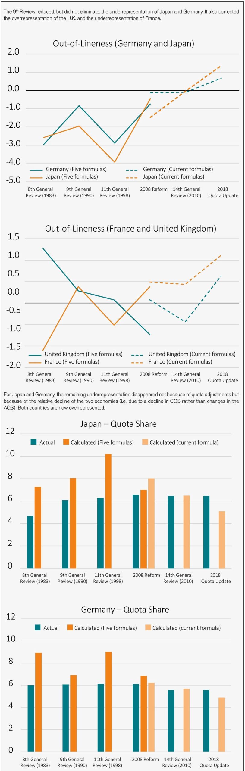 - Second, as China’s underrepresentation is massive, it can only be eliminated by a succession of partial adjustments. Japan’s underrepresentation was not eliminated in the 9th Review but only reduced (Table 1). As the weight of Japan in the global economy continued to grow, Japan’s OOL was larger by the time of the 11th Review than it was on the eve of the 9th Eventually, Japan’s and Germany’s underrepresentation disappeared but this was not the result of quota adjustments but rather the result of the decline of their relative position in the world economy driving a reduction CQS (Figure 1).