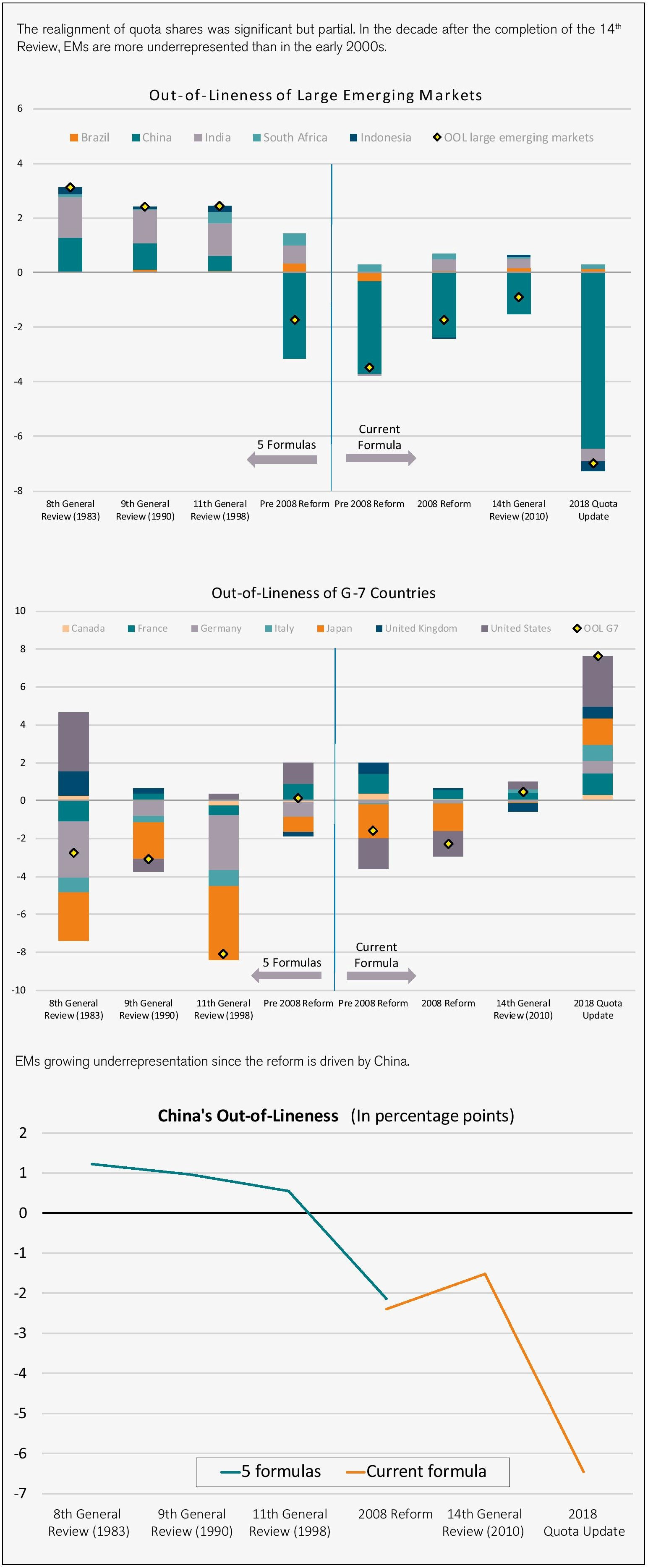 EMs’ voting shares were increased in two phases. In 2008, overall quotas where increased by 1.8 percent to allow an increase in the quota of four highly underrepresented members: China, Korea, Mexico, and Turkey. The quota share of other members was uniformly reduced. Then, in 2010, an additional shift of quota shares to 54 “emerging market and developing countries” (including the four countries who benefited from the 2008 adjustment) took place. Altogether, this reduced by 2/3 the combined underrepresentation of the four most underrepresented members (Figure 3).