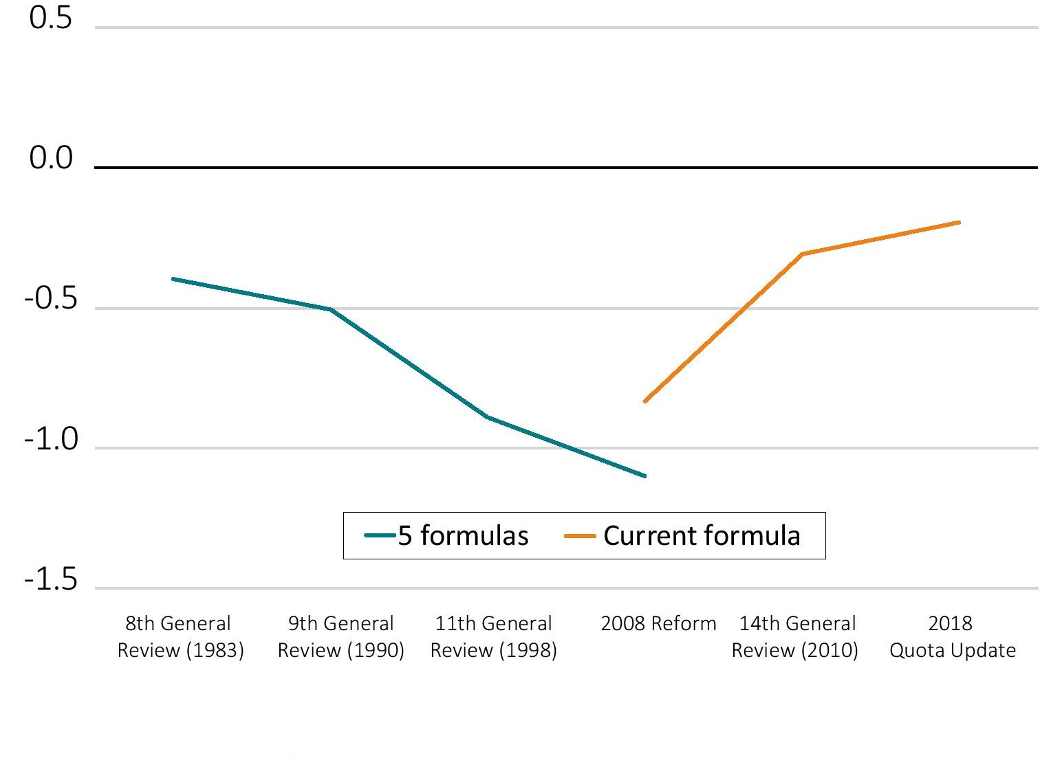 - European countries paid most of the price of the Quota and Voice reform with a decline in their quota and voting shares and a reduction of the number of European chairs at the Executive Board. Germany, the U.K., France, and Italy all experienced a decline in their quota and voting shares. Nonetheless, they remain overrepresented. Their combined quota share is about 2.2 percentage points lower than before the Quota and Voice Reform and their voting share by 2.7 percentage points lower, but both remain about 3.3 percentage points above what the quota formula implies.