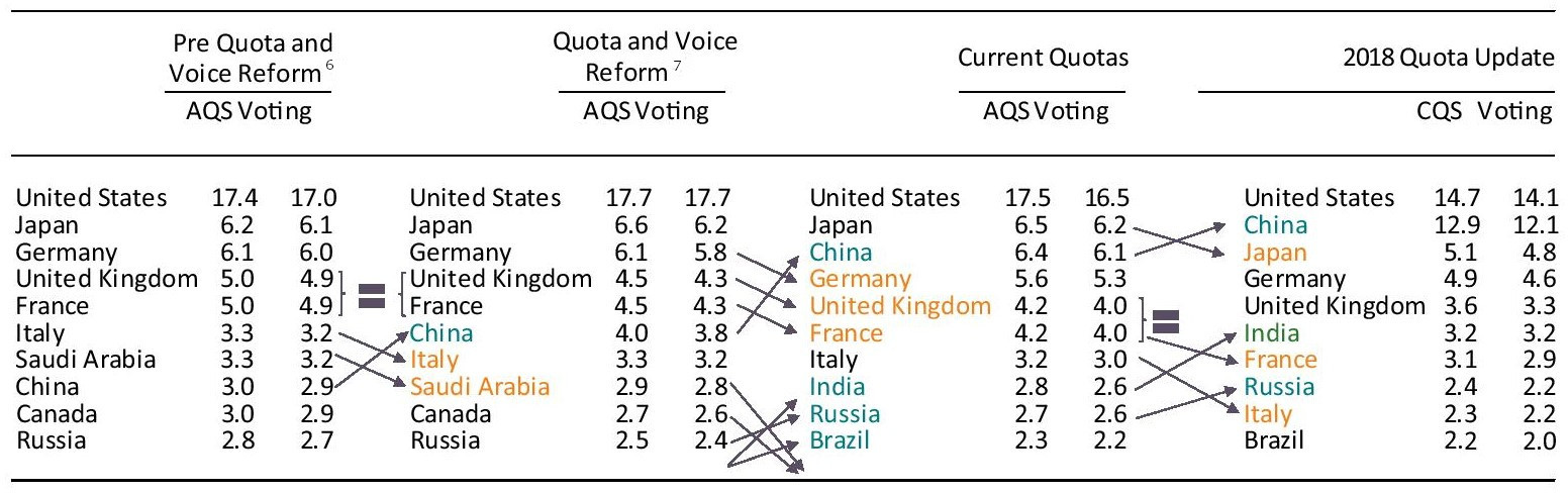 Table 2 summarizes the impact of the Quota and Voice reform and of the 14th Review. It shows that: