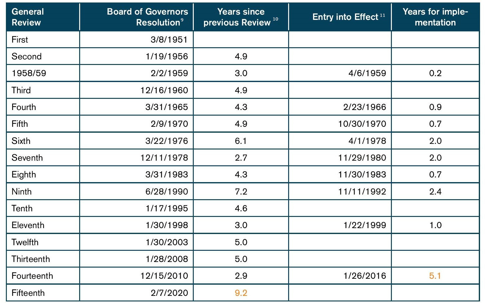 Eventually, the review of the quota formula did not allow to reach an agreement on a new formula (IMF, 2013), which remains part of the governance reform agenda (IMFC, 2019; IMF, 2020b);[8] the 14th Review, concluded on December 2010 entered into force only in January 2016 (the longest implementation delay in history due to the slow approval process by the U.S. Congress, Table 3); and the 15th Review, the longest in history, was not concluded in 2014, but in 2020 (IMF, 2020b) and without any agreement for a quota increase, a quota realignment, or the expected governance reforms.