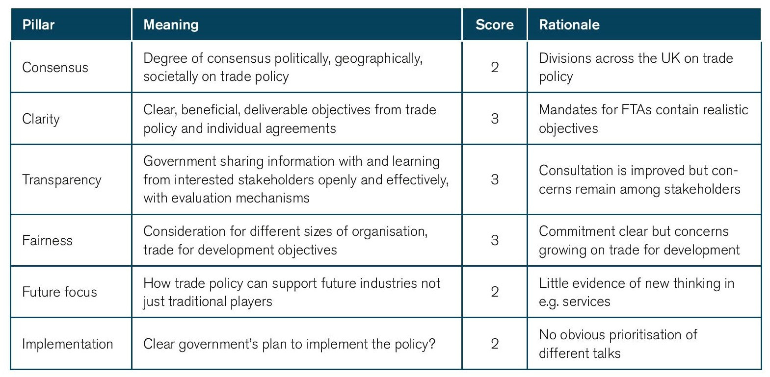 It is a significant workload which we examine further in this report. We consider progress to date, update our assessment of the UK’s readiness for an independent trade policy, analyse how these efforts are viewed by potential trade partners, and consider what may constitute a future vision for UK trade policy, in the absence of an officially published one.