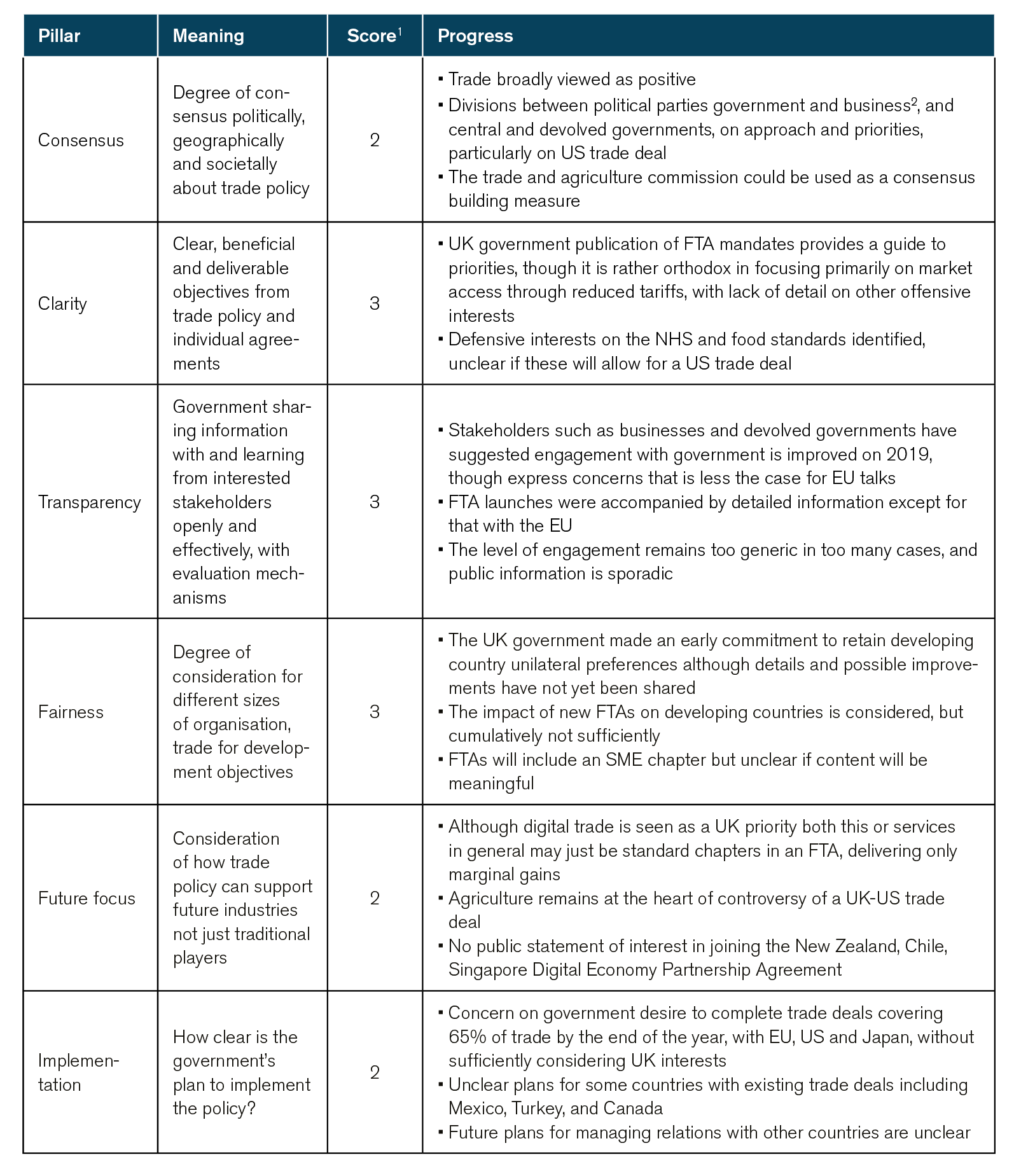 The activity is reflected in part in this year’s analysis. We see identifiable progress in terms of the UK’s ask from trade policy, although the published FTA mandates seem clearer in tariff reduction than other areas of policy, and consultation with stakeholders. However we remain concerned at the lack of consensus. In 2018 we wrote that “UK ministers, other politicians, and officials need to urgently recognise the need to build a national consensus and consult upon this – in particular if a new trade agreement with the US is to be considered they must consider whether a realistic mandate would pass parliament.”