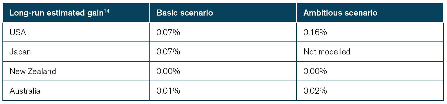 Overall, the impression given is that for the UK government the most important thing is the delivery of deals, regardless of economic potential or matching a vision. Potential gains from Australia and New Zealand FTAs are negligible, and while those from Japan and US trade deals are greater, these also rely on optimistic scenarios with regard to the removal of non-tariff barriers, even in the basic scenario.