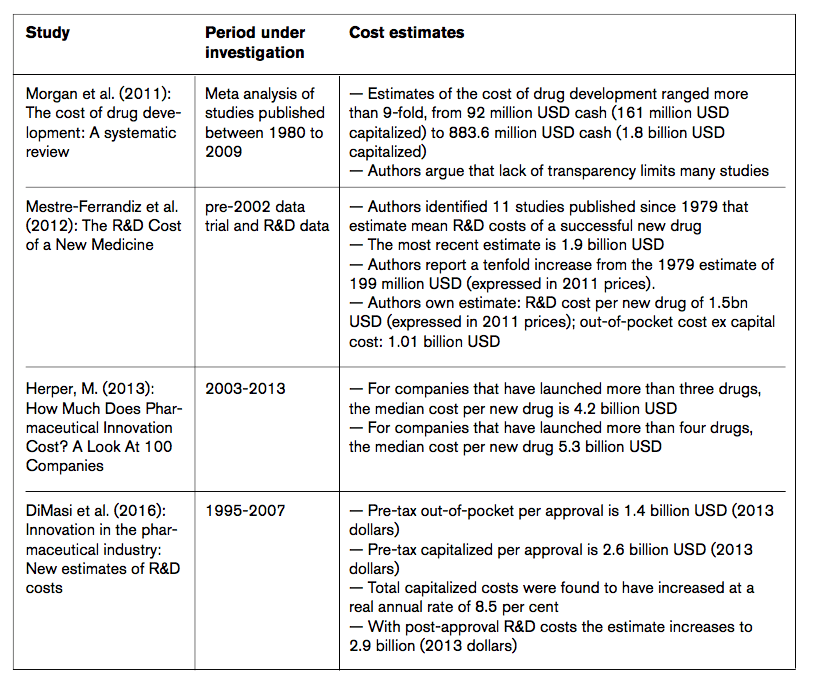 Mestre-Ferrandiz et al. (2012), for example, report that the costs of pharmaceutical R&D activities vary for various kinds of drugs, depending on therapeutic area, firm sizes and whether the molecule is a ‘traditional’ chemical compound or a biologic. On average, the authors find that drug development costs amount to an average 1.5 billion USD expressed in 2011 prices. Herper (2013) presents R&D cost data for 98 companies and (roughly) estimates drug development costs to amount to up to 5.3 billion USD per approved drug. The study by DiMasi et al. (2016) estimates the pre-tax capitalized R&D cost per approval of up to 2.6 billion USD. When post-approval R&D costs are included, the average cost rise to 2.9 billion USD. The estimates reflect the full cost of gaining regulatory marketing approval for a new drug (see Table 1).
