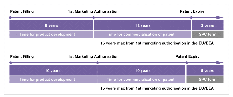 Source: own illustration derived from Pharmaceutical Compliance Monitor (2013). The figure shows two examples and how the SPC term is calculated based on the different times spent on development in two cases (in the first example 8 years and in the second example 10 years).