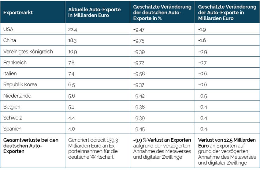 Tabelle 1: Die Kosten der verzögerten Annahme des Metaverses für deutsche Auto-Exporte