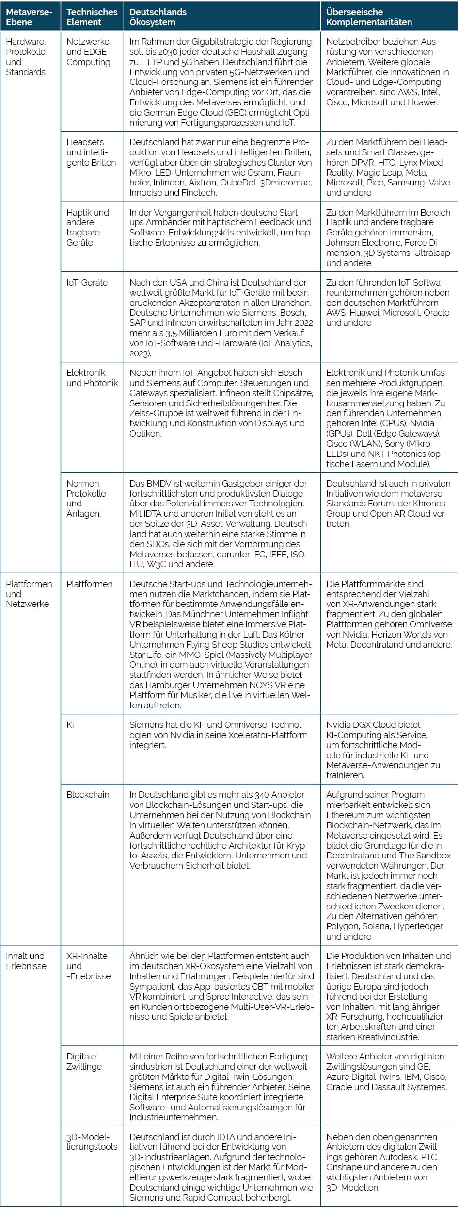 Tabelle 2: Der aktuelle Zustand des Metaverse-Ökosystems in Deutschland
