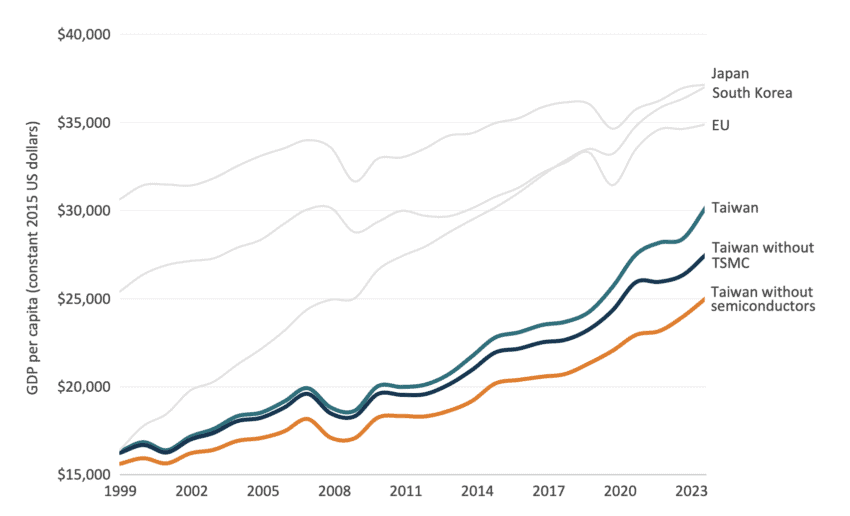 Figure 3: Taiwan’s real GDP per capita with and without TSMC and semiconductors, 1999–2024