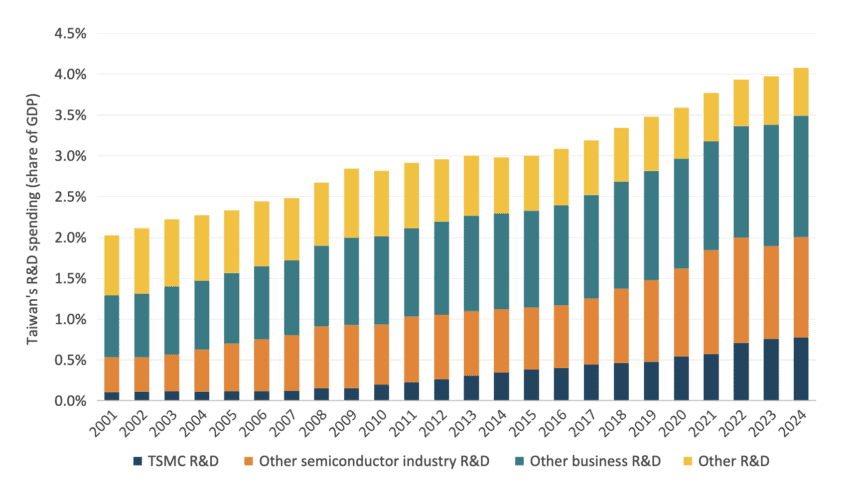 Put differently, Taiwan’s ascent to the top tier of global R&D spenders over the past 25 years is overwhelmingly the result of sustained increases in private-sector innovation investment, led by TSMC and the semiconductor industry, but reinforced by a broader rise in business-driven R&D across the economy.