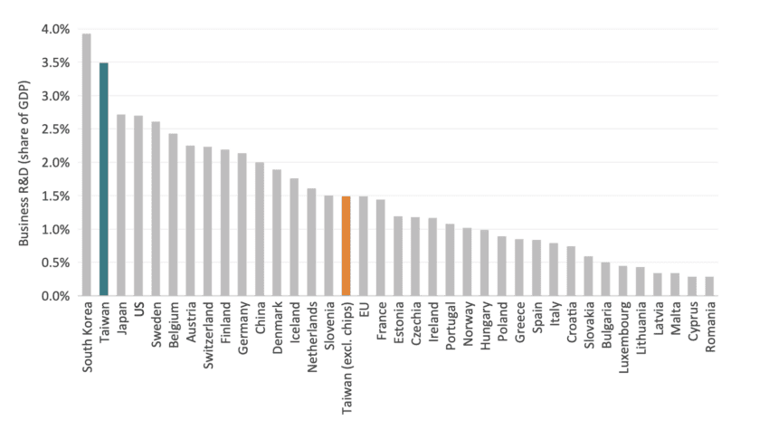 Indeed, even without the chip sector, Taiwan’s business R&D intensity would remain slightly above that of the EU as a whole. Individually, Taiwan would still outspend 19 of the EU’s 27 Member States in business R&D as a share of GDP.