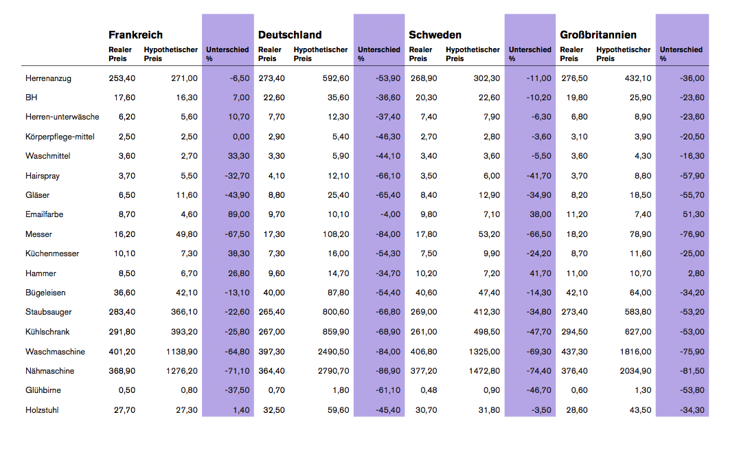 [28] Folgende Methode wurde verwendet: 1) Wir haben einige typische Haushaltswaren ausgesucht, bei denen sich Produktionsort und internationale Handelswege im betreffenden Zeitraum deutlich verändert haben. 2) Wir haben die tatsächlichen Preise dieser Produkte für die Jahre 1970 und 2005 gesammelt, und zwar für Frankreich, Deutschland, Schweden und Großbritannien. Die Preise von 1970 richten sich nach Erixon & Lewander, 2005, die die realen Preise für Produkte in Schweden untersuchten. Die realen Preise für ähnliche Produkte im Jahr 2005 wurden für jedes Land einzeln zusammengestellt. Bei den Produkten 2005 haben wir Waren mit etwas besserem „Standard“ als 1970 gewählt. Auf dieser Weise wollten wir eine Überbewertung des Preis-Effekts verhindern. Hätten wir zum Beispiel für 2005 bei Herrenanzügen ein Modell der Billig-Kette Hennes & Mauritz genommen, wäre der Effekt noch größer gewesen. 3) Der Nominalpreis 1970 ist der Ausgangspunkt für ein alternatives Szenario, das untersucht, wie sich der Preis bis 2005 entwickelt hätte, wenn er dem Verbraucherpreisindex gefolgt wäre. Der hypothetische Preis spiegelt also die inländischen Preisverhältnisse wider und nicht die internationalen (durch Handel). Der Verbraucherpreisindex gibt nicht nur Aufschluss über die Preisentwicklung im Land, sondern ist in unserem Fall auch ein besserer Preisindex als der BIP-Deflator oder der Herstellerpreisindex. Wir haben den Verbraucherpreisindex (VPI) angepasst und um die Importe bereinigt. Dabei wurde der jährliche Standard-VPI um den jährlichen, von der OECD veröffentlichten Wertindex für die Importe der einzelnen Länder und damit um die Importdurchdringung bereinigt. 4) Anschließend vergleichen wir den realen Preis 2005 mit dem hypothetischen Preis 2005.